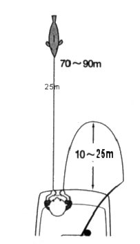 その為にはベイトの大きさによりフックのサイズや、フックのベンド部分に作るダクロンの輪の大きさが違うので、リグは少なくとも3種類ぐらいは用意しておかなくてはなりません。ベイトを捕獲してから流し始めるまでの時間は慣れたクルーになると、わずか10秒以内で完璧に行いますが、10秒とはいかないまでも、その2倍位の時間がかっかってもいいので、ベイトにダメージを与えず元気なままで流すことの方が大切です。何度も目通しの練習を行ない、テクニックを身に付けます。