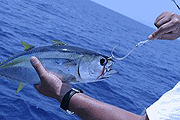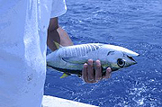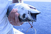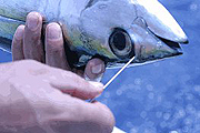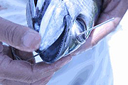 カツオ/キハダは、写真のように逆さに持ってやるとおとなしくなります。長時間保持したり魚の体を脇の下に着けると暴れてしまいます
