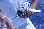 奇数回転にしないとフックのポイントが上に向かず、ライブベイトに刺さってしまって、動きが悪く成ったり、すぐに弱ってしまします、又カジキがヒットしてもフックアップの確立が悪くなってしまいます。