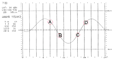 一般的には 「下げ7分から下げ9分」、「上げ3〜4分」、「上げ7〜8分」「下げ2〜4分」 といった言い方をする時合どきです。これらの時間帯をイメージしたのが写真の中のイラストです。アルファベットの順でいくと、B・D・A・Cとなります。トーナメントではこのことを念頭において潮汐曲線の中にスタートフィッシングとストップフィッシングの時間を書き込みます、そうすると真剣に狙う時間がわかるわけです。この時間帯は戦略を立てる上で、前提条件となるものなのでしっかりと覚えておいて頂きたいことです。