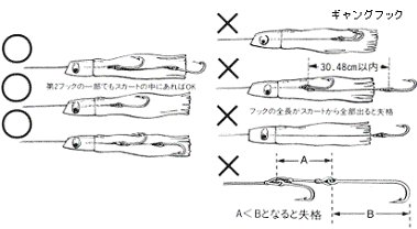 スカートまたは トレーリング材を取り付けたルアーを使用する時は、ライン、リーダーに取り付けて使用することができる。フックは別々に取り付ける必要はない。この場合、2本のフック・アイは互いにフックの長さ(使用されているフックの大きい方の全長)以上離して取り付けなければいけないが、30.48cm(12インチ)以上離してはいけない。例外として、フックの先端にもう1本のフックのアイを通すのはかまわない。トレーリング・フック(後方のフック)は、ルアーのスカートから全長がはみだしてはいけない。