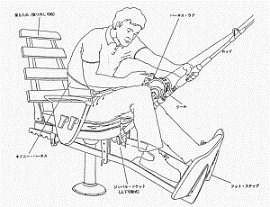 アングラーはファイティングチェアーに座ると同時に竿尻をジンバルに収め、身に付けたハーネスやバケットハーネスのスナップをリールのハーネスラグに取り付けます。そして、フットレストで足を支えることにより、激しい巨魚の引きに耐えることができます。