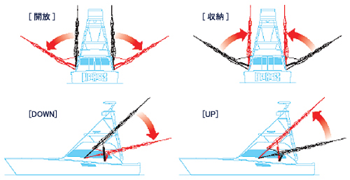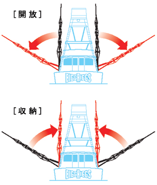 これまで面倒だったアウトリガーの開放/収納作業がボタン操作だけで可能となります。